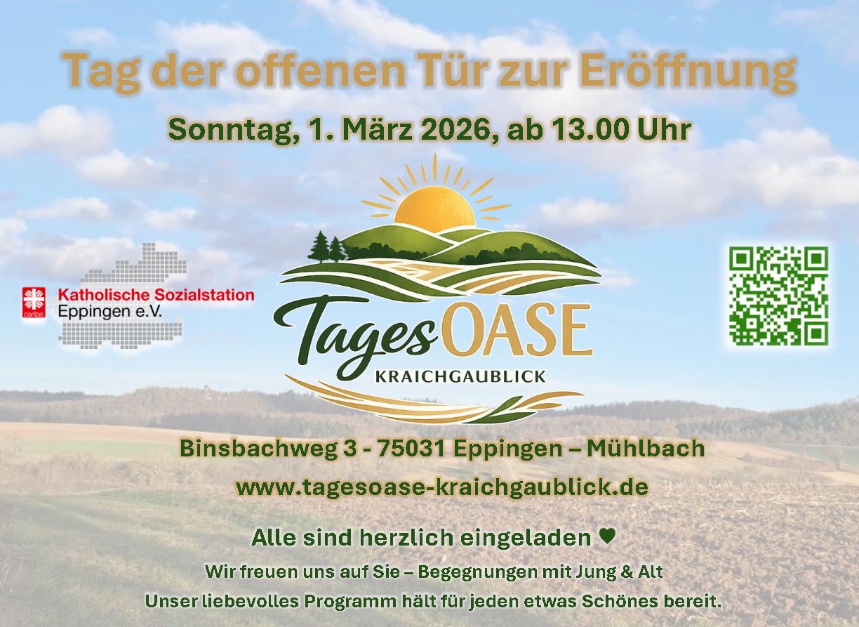 Am 1. März 2026, ab 13.00 Uhr öffnet die TagesOASE Kraichgaublick in Eppingen-Mühlbach ihre Türen. Die neue Tagespflegeeinrichtung bietet pflegebedürftigen Menschen einen Ort der Betreuung, Gemeinschaft und Geborgenheit – und entlastet zugleich pflegende Angehörige im Alltag.