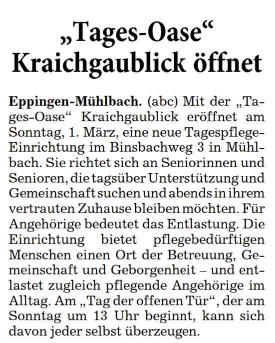 RNZ 28.02.2026 „Tages-Oase“ Kraichgaublick öffnet
